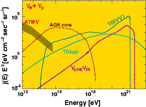 You see bumps in the predicted UHE neutrino spectrum, which are created by many secondary neutrinos in the neutrino cascades. They are most outstanding in the top down (TD) model with neutrino decay mode.